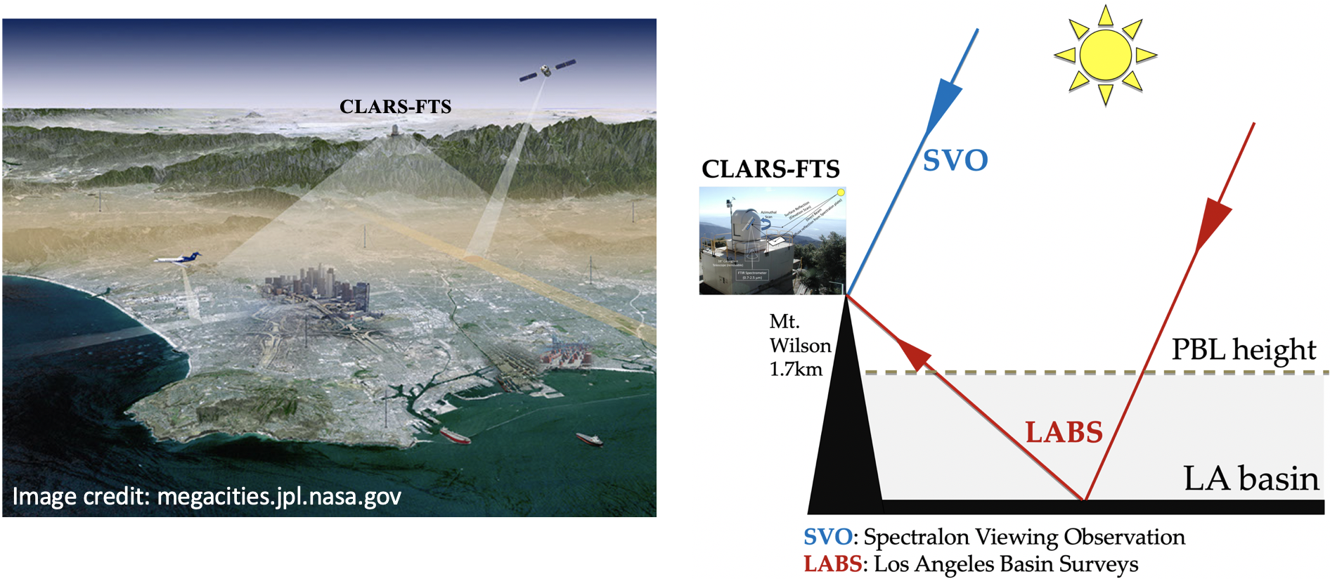 The FTS operates in two modes: the Spectralon Viewing Observations (SVO) and the Los Angeles Basin Surveys (LABS). In the SVO mode, the Fourier Transform Spectrometer (FTS) points at a Spectralon® plate placed immediately below the FTS telescope to quantify the total column trace gases above the Los Angeles megacity (above 1670m and the basin PBL height). The SVO measurements represent approximately free tropospheric background levels. In the LABS mode, the FTS points downward at 33 geographical points in the basin acquiring spectra from reflected sunlight in the near-infrared region. Our measurement technique from Mount Wilson mimics satellite observations that measure surface reflectance from space or atmospheric absorptions of GHGs along the optical path – (1) from the sun to the surface and (2) from the surface to the instrument. The locations of the reflection points are selected to provide the best coverage of the megacity.