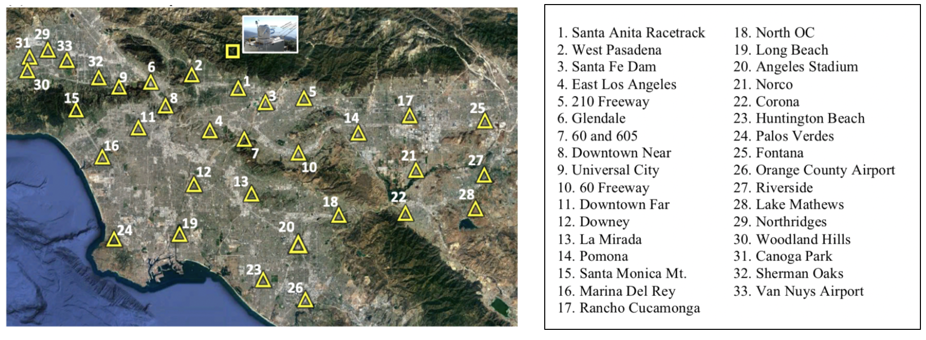 In addition, reflection points are chosen with uniform surface albedo across the spectrometer field of view using a near-infrared camera. Reflection points sample from the San Bernardino Mountains in the east to the Pacific coast in the west and from the base of the San Gabriel Mountains in the north to Long Beach Harbor and Orange County in the south. The footprints in the Los Angeles megacity are ellipses with surface area ranging from 0.04 to 21.62 km2.
